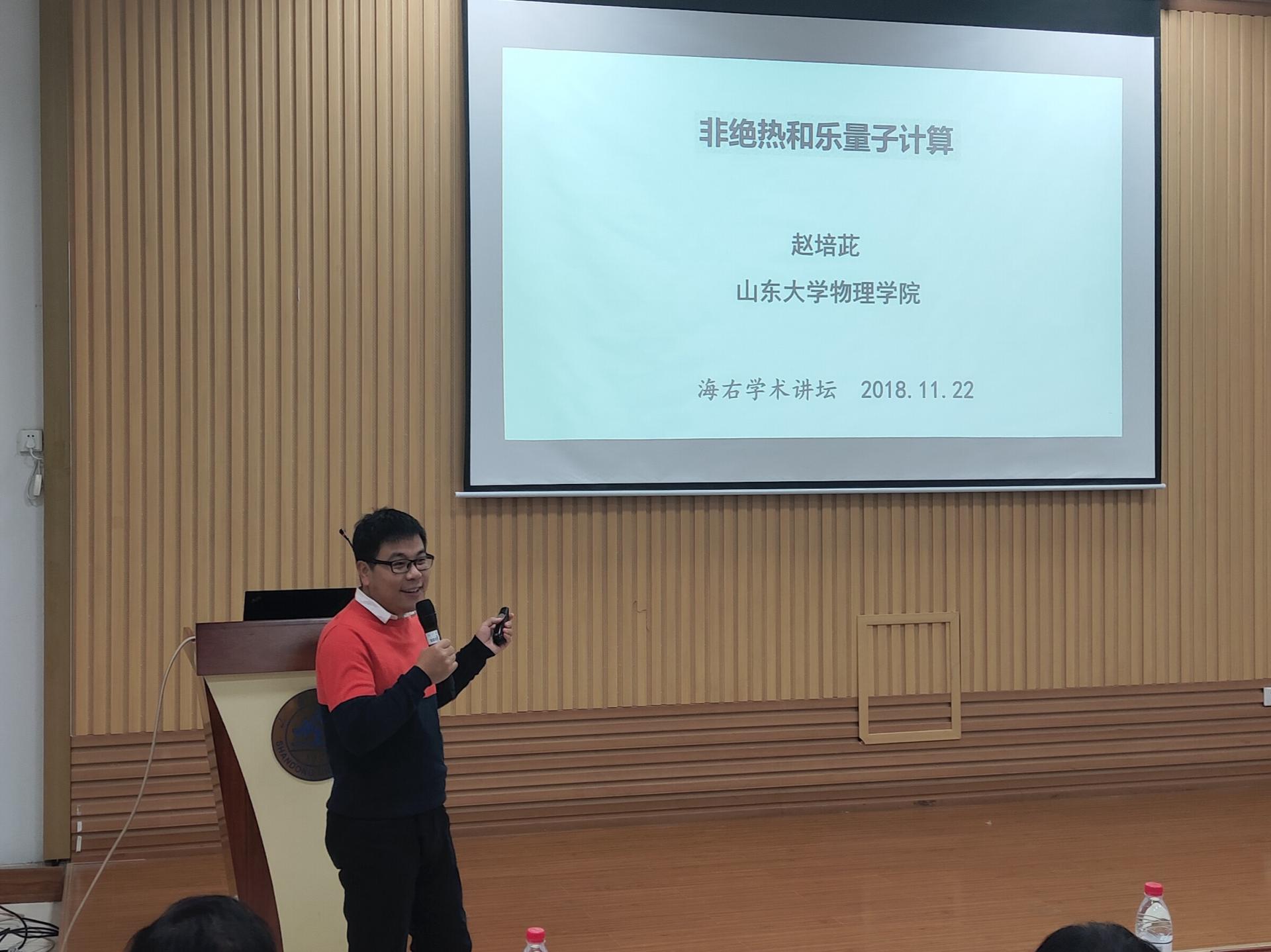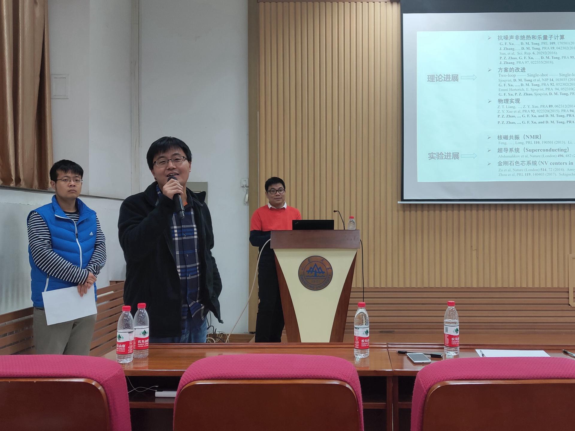 赵培茈博士作了题为《非绝热和乐量子计算》的报告。他从研究背景、非绝热和乐量子计算方面的研究工作、科研过程中的启示等几个方面作了详细介绍。赵培茈博士首先深入浅出地讲解了量子计算所面临的挑战、几何量子计算的研究进展和非绝热和乐量子计算。其次,对于科研方面的工作,他以建立DFSs上的非绝热非传统几何量子计算和一步实现的任意非绝热和乐门以构建抗噪声的非绝热和乐量子计算,基于里德堡原子和里德堡超原子的非绝热和乐量子计算的物理实现为示例进行了详细的介绍。最后,他又分享了自己在科研过程中的启示:即科学研究要着眼于重要的科学问题,并且要培养一些习惯,如勤奋诚实、学思并进、合作讨论,在这个科研过程中建立批判与信任的辩证关系,启发在场的同学要有问题意识,遇到问题要灵活运用自己所能够使用的资源去解决问题。