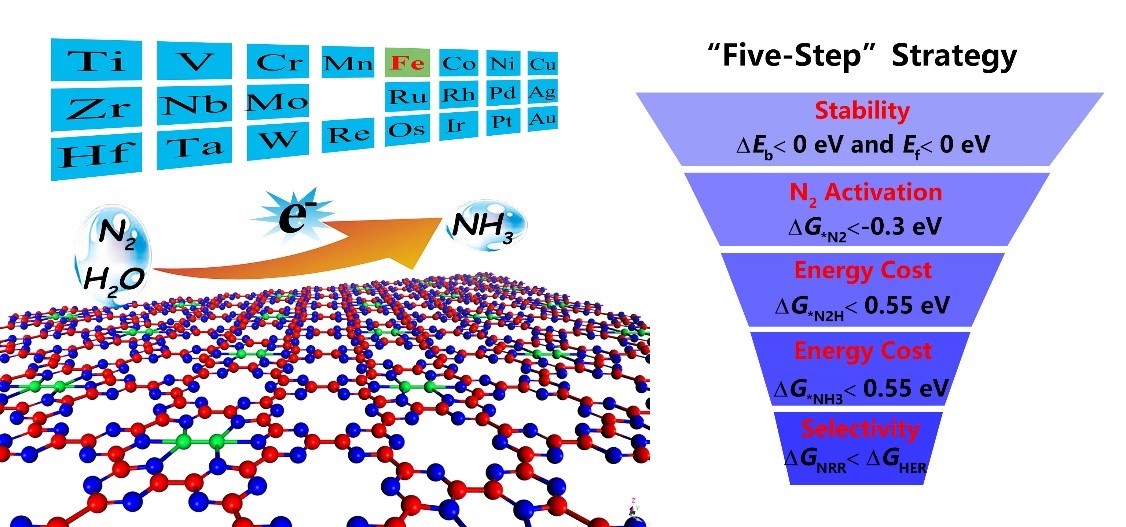 在双原子催化剂中,金属原子之间的协同作用赋予其远优于单原子催化剂的催化性能。相较于单原子催化剂,双原子催化剂中的两个单原子在催化反应中可以发挥不同的功能,二者的协同作用不仅可以最大程度上提高原子利用率,重要的是可以提高催化的选择性。戴瑛教授团队发现,g-CN负载的双过渡金属原子可以作为一种新型的NRR电催化材料。通过第一性原理高通量筛选,在23种催化剂中,Fe2/g-CN表现出最优的催化活性,其限制电位仅为-0.13 V,标志着一种新型、高效的电催化合成氨反应材料体系。重要的是,通过建立多尺度的催化活性描述符,为原子相互作用提供了解释,并有助于筛选最有潜力的双原子催化剂,突破了传统的试错合成的局限性。该研究对开发新型NRR电催化材料具有重要参考价值。
