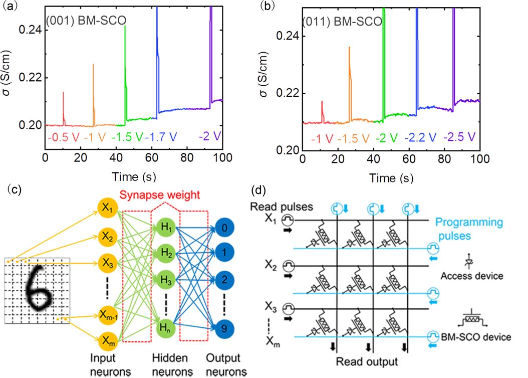 人工神经网络是实现人工智能最佳选择之一,离子迁移操作的三端器件成为模拟神经元之间生物连接(突触)的自然选择。与两端器件相比,三端器件具有同时进行读和写的优势。近年来,许多复杂的人工突触被建立起来,以实现记忆和遗忘、学习和逻辑计算等功能,并在大规模电解质晶体管阵列中表现出较高的计算精度、快速开关速度和低能耗的良好性能。然而,在生物系统中,存在着种类繁多的兴奋性和抑制性神经元或突触遵循不同的计算和可塑性规则共同发挥作用。通过开发具有可调响应能力的人工突触器件,在人工突触领域实现类似的多样性仍然是一项具有挑战性但紧迫的任务。因此,我们在单晶氧化物中通过改变衬底取向或者通道层的制备方向获得了不同响应能力的人工突触器件。