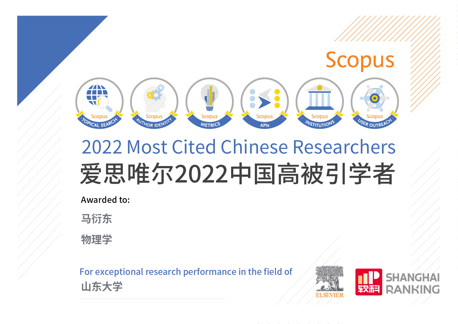 2023年3月28日,2022爱思唯尔(Elsevier)“中国高被引学者”(Highly Cited Chinese Researchers)年度榜单正式发布。山东大学开云online(中国)陈峰、赵明文、戴瑛、马衍东四位教授入选“物理学”学科榜单。其中陈峰教授和赵明文教授连续9年上榜(2014-2022),戴瑛教授和马衍东教授是第3次获此殊荣。