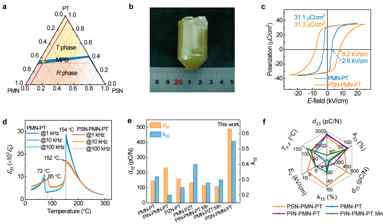 本文在Pb(Mg1/3Nb2/3)O3-PbTiO3(PMN-PT)弛豫铁电单晶中掺杂少量Sc元素,形成新型三元系Pb(Sc1/2Nb1/2)O3-Pb(Mg1/3Nb2/3)O3-PbTiO3(PSN-PMN-PT)晶体。PSN-PMN-PT单晶具有非常弥散的局域异质结构,且其中包含强晶格畸变的四方相钉扎中心,在热力学上使其自由能结构具有增强的势垒和平坦的势阱。这一结构使单晶同时具有高矫顽电场(EC=8.2 kV/cm,约为 PMN-PT单晶的3倍)和超高压电性能(d33 = 2630 pC/N,d15 = 490 pC/N)。这一研究为从原子角度改善铁电体的功能特性提供了一种简单、实用和通用的途径,这对于未来材料的设计至关重要。