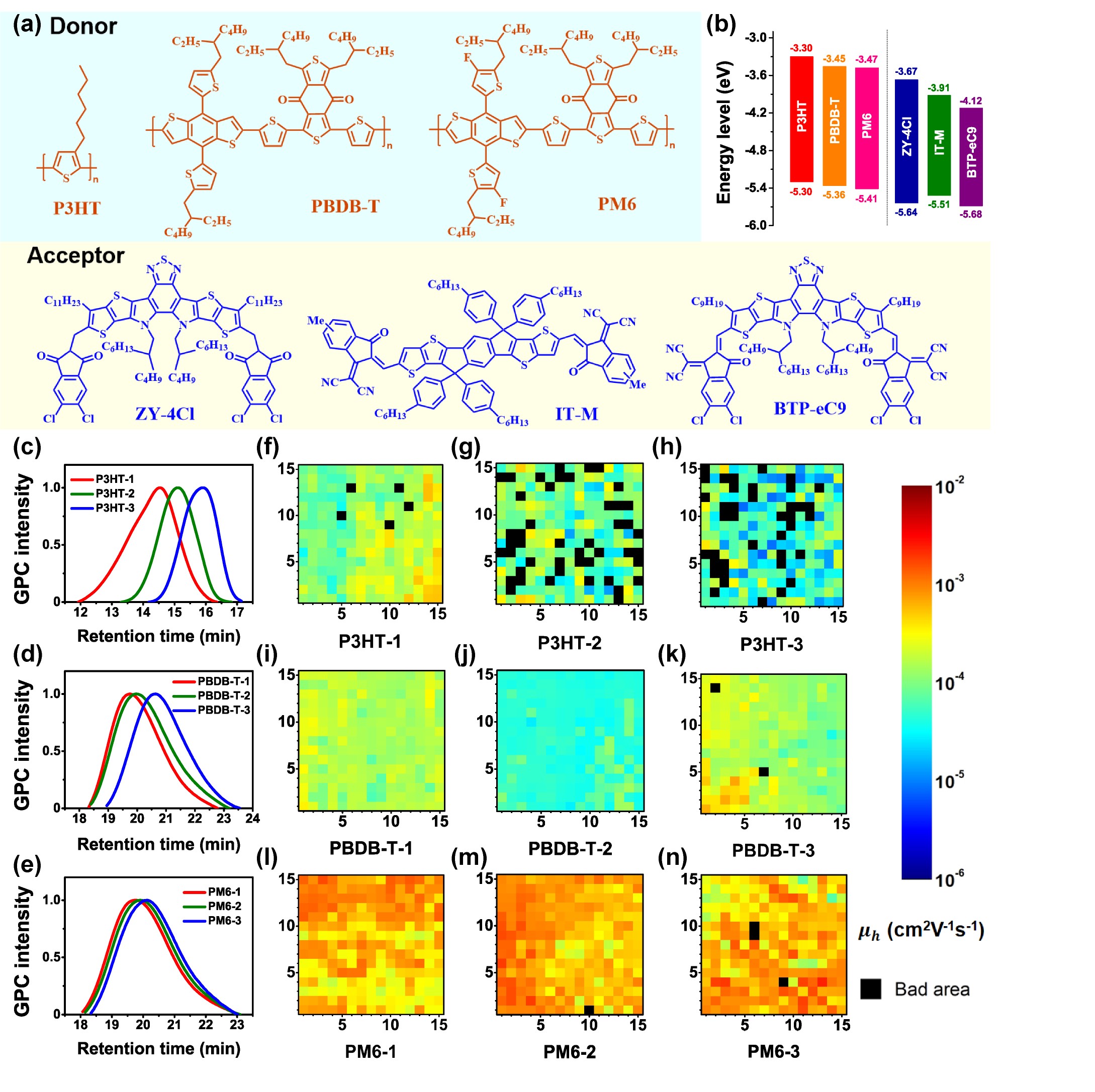 在此工作中,研究团队利用网格化电极方法提出了一种简便有效的手段来衡量大面积薄膜迁移率的均匀性。并结合此方法与一系列光物理表征技术,系统性地研究了聚合物给体分子量与器件可重复性的联系。高迁移率、低能量无序度、高空穴转移速率的高分子量体系表现出更优秀的器件性能和重复性。该工作揭示了聚合物分子量与器件重复性之间的相关性,并为有机电子器件的商业大规模生产提供了新的视角。相关研究成果以“Reproducibility in time and space – the molecular weight effects of polymeric materials in organic photovoltaic devices”为题发表在期刊Small Methods上,论文第一作者为开云online(中国)2021级研究生桂若华,郝晓涛教授、殷航教授为该论文的共同通讯作者,山东大学为第一作者单位和第一通讯作者单位。