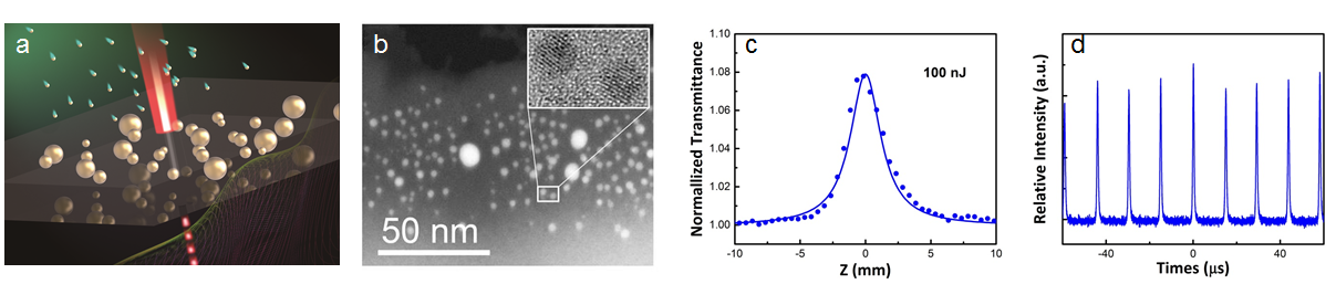 近日,陈峰课题组在《Nanoscale》(影响因子为7.367)上发表题为“Plasmonic nanoparticles embedded in single crystals synthesized by gold ion implantation for enhanced optical nonlinearity and efficient Q-switched lasing”(Nanoscale 10, 4228-4236, 2018; DOI: 10.1039/C7NR07304F)的研究论文,报道了金离子注入Nd:YAG单晶中纳米颗粒的合成及其光学特性。论文被选为Nanoscale当期的封底(back cover)。该论文的第一作者是博士研究生聂伟杰,通讯作者为陈峰教授。研究通过金离子注入和热退火处理在Nd:YAG晶体中合成了嵌入式纳米球颗粒,产生表面等离激元共振效应(SPR),使得Nd:YAG晶体在可见光波段的线性和非线性吸收都显著增强。其中,晶体的非线性吸收系数提升了5个数量级,同时表现出明显的可饱和吸收特性。利用Au:YAG作为饱和吸收体,实现了波长为639nm的调Q脉冲激光输出。另外,通过改变金离子的注入剂量可以有效调控材料的线性和非线性光学性质,从而为增强、调控介电材料的非线性性质提供了一种新的方案,为在脉冲激光产生中的应用提供了基础。