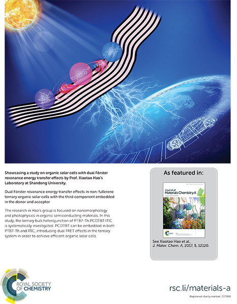 近日,《J. Mater. Chem. A》以“Dual Förster resonance energy transfer effects in non-fullerene ternary organic solar cells with the third component embedded in the donor and acceptor”为题发表了我院郝晓涛课题组开云登陆入口有机太阳能电池物理机制的研究结果(J. Mater. Chem. A, 2017, 5, 12120-12130; DOI: 10.1039/C7TA01557G),并选为封底内页(inside back cover)进行介绍。论文第一作者是博士研究生毕鹏青,通讯作者是郝晓涛教授。