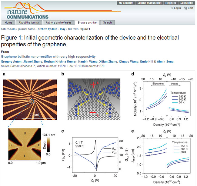 山东大学纳电子中心近期与英国曼彻斯特大学合作,成功在室温条件下研制出基于石墨烯的新型纳米弹道整流器。该器件采用高质量石墨烯,石墨烯材料迁移率为200,000 cm2/Vs。新型器件为单层结构,两输入端与两输出端正交,使器件的噪声只受热噪声限制。新型器件在室温下的等效噪声功率降至0.64 pW/Hz1/2,这应是当前最灵敏的固态探测器。此器件的优异性能与超导辐射热测定器相当,但是后者需要工作在4K低温环境中。相关论文“Graphene ballistic nano-rectifier with very high responsivity”于5月31日在线发表于Nature Communications。