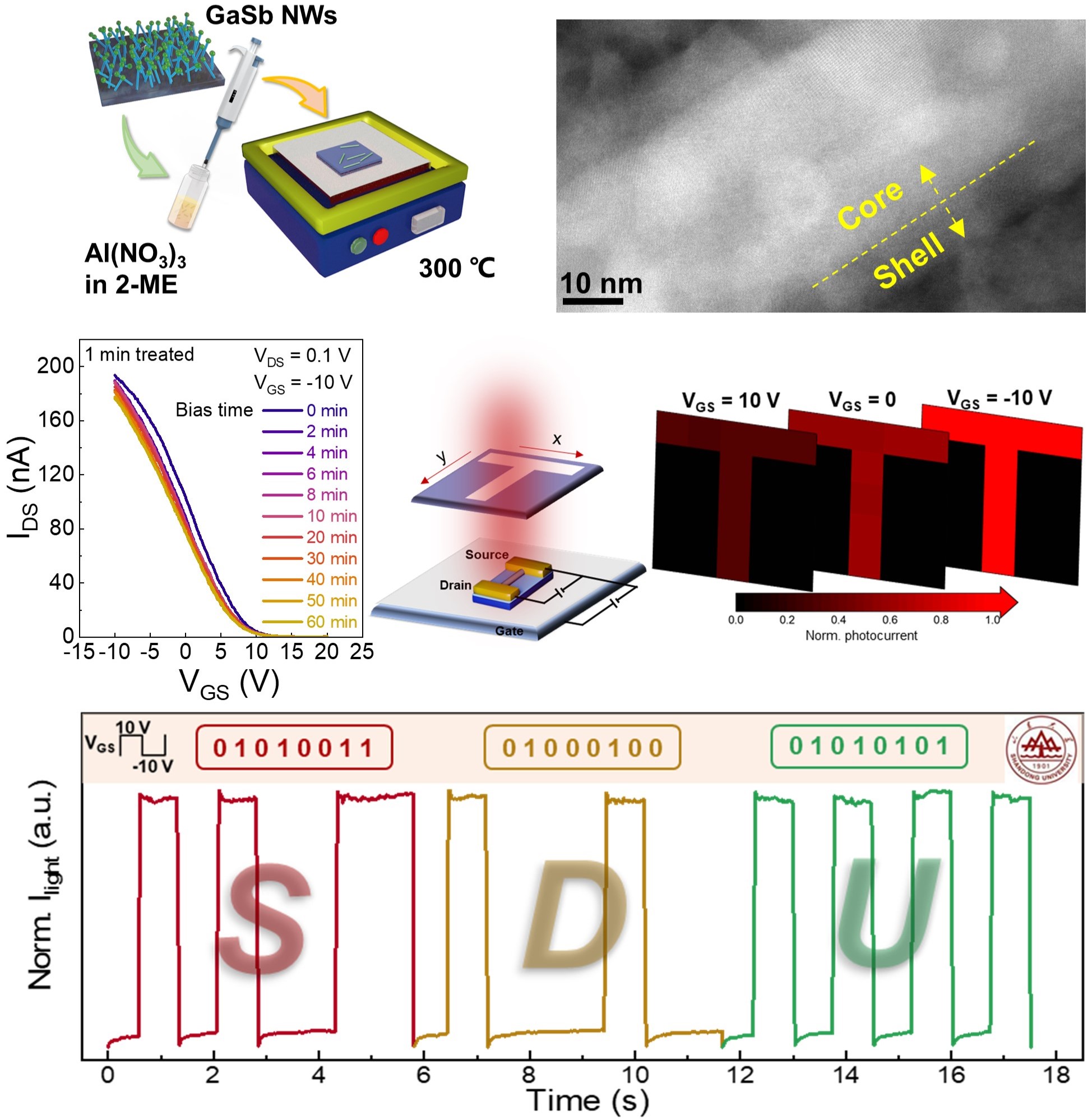 图2. 通过低温溶液-退火法调控锑化物纳米线表面态,实现了稳定的栅极调控红外探测性能的光电子器件