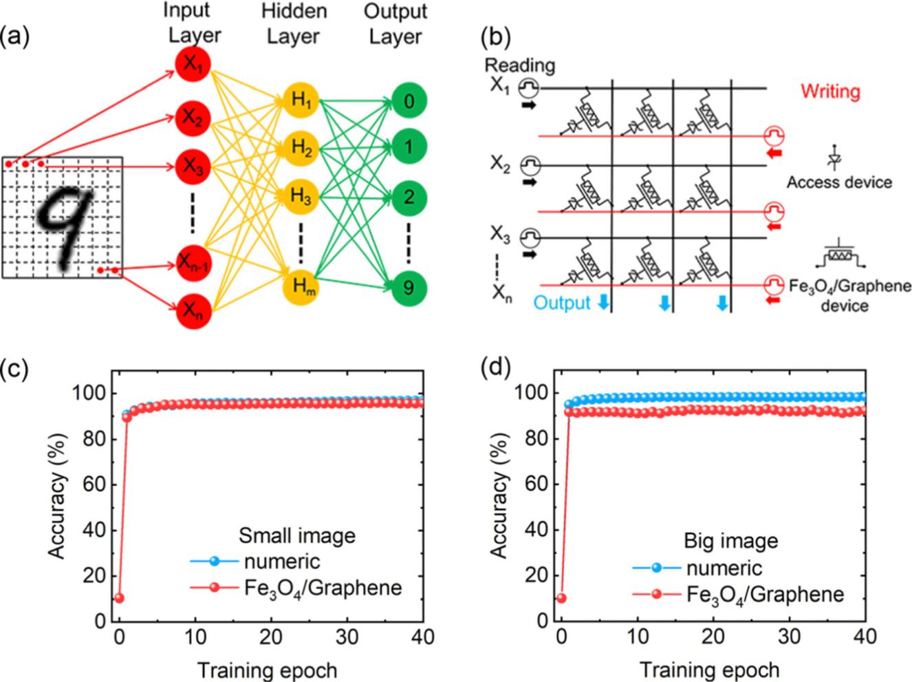 进展二:多感官人工突触在生物仿生学和人工智能领域具有广阔的应用前景。胡季帆教授团队在Fe3O4/graphene晶体管中利用离子液体电场和紫外光双场的激励下实现了多感官人工突触的模拟。团队成员利用石墨烯对氢离子的筛选作用获得了离子液体电场下氢离子迁移诱导的电导率调控,并基于此模拟了人工神经突触的长、短期可塑性,构建了三层人工神经网络用来模拟图像识别的应用功能,准确率高达96.72%。另外,团队利用紫外光场和电场对电导率的双场调控,在Fe3O4/graphene 突触器件上进一步实现了一系列布尔逻辑运算。该工作为同时感知和处理多个物理信号的人工智能领域提供了良好的平台。相关工作以“Multisensory synapses based on Fe3O4/graphene transistors for neuromorphic computing”为题发表于J. Mater. Chem. C期刊(2023, 11, 7732–7739),苗停停博士、刘伟康博士、小米科技有限公司黄存刚工程师为文章共同一作,崔彬和胡季帆教授为文章共同通讯, 山东建筑大学谢继浩博士、中国空间技术研究院航空五院陈娟、开云online(中国)成彬博士为文章合作者。