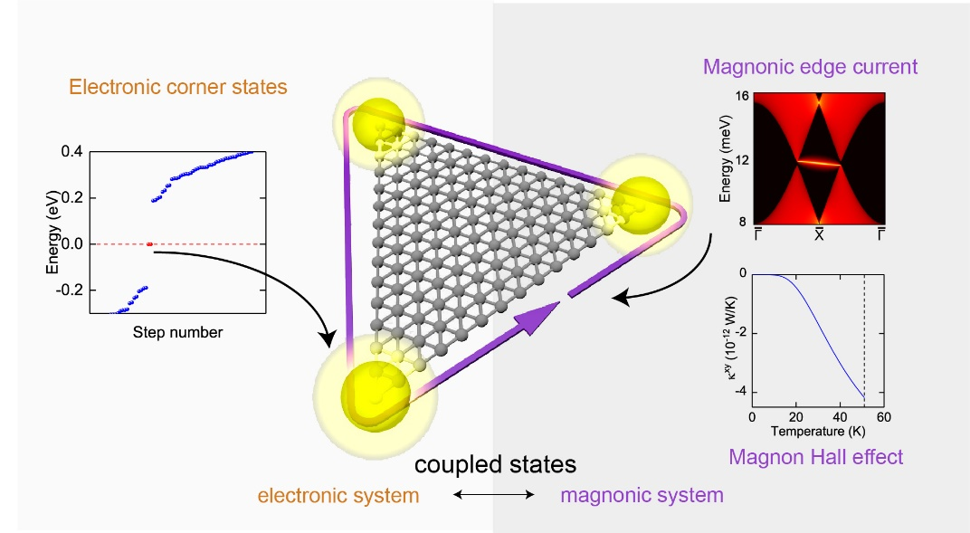 进展一:拓扑物性不仅限于费米子系统,还可以存在于玻色子系统,例如磁子系统。然而,同时具有电子和磁子拓扑物性的材料却尚未有报道。戴瑛教授团队揭示了一阶拓扑磁振子绝缘体(TMI)和电子二阶拓扑绝缘体(SOTI)在二维蜂窝铁磁体中的共存机制,并预测了一系列可在实验中实现的材料,如MoI3、CrSiTe3和CrGeTe3单层等。在磁子系统中,由次近邻 Dzyaloshinskii-Moriya 相互作用引起的相因子破坏了赝自旋时间反转对称性,导致磁振子带节点的分裂,形成陈数为 1 的 TMI。此外,在 C3 旋转对称性的保护下,电子 SOTI 具有显著的非平庸角态特征。该工作极大地丰富了人们对磁性拓扑物态的理解和认识。相关研究成果以“Coupled Electronic and Magnonic Topological States in Two-Dimensional Ferromagnets”为题发表在国际期刊ACS Nano上。论文第一作者为2023级博士生白英希,牛成旺教授、戴瑛教授以及江苏大学的张礼川教授为共同通讯作者,山东大学为第一作者单位。