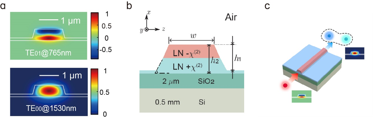 铌酸锂(Lithium Niobate,LN)具有宽的透明窗口、较高的折射率以及较大的声光、非线性和电光系数,是一种极具吸引力的光子材料,有“光学硅”之称。LN的最大非线性系数d33 = -34.4pm/V,对应的高效率非线性转换可以用来产生基于自发参量下转换(SPDC)的量子光源。近年来,随着绝缘体上的铌酸锂薄膜(LNOI)迅速发展,LNOI片上的量子光源展现出了相对块材LN的优势,因此备受关注。要实现高效非线性转换过程,必须要解决相位失配的问题。传统的方法是基于铌酸锂畴反转机理的准相位匹配(QPM)技术,QPM需要外加强场(电场、光场等)来实现铌酸锂畴反转,且周期极化畴的不均匀性会影响SPDC的效率。另一种是基于模式的相位匹配(MPM),利用基模和高阶模的折射率差实现泵浦光和信号光之间的相位差,从而实现相位匹配。不同于QPM,MPM不需要复杂的后加工技术,而且实现的是相位匹配,可以最大利用d33。然而,受制于基模和高阶模的电场分布模式(如图1a所示),模式会相互抵消,进而影响SPDC的效率。