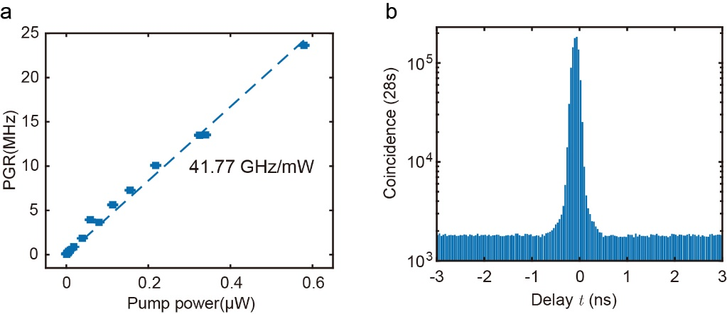 针对这一问题,研究团队设计并制备了双层LNOI(如图1b所示),两层LN薄膜具有相反的轴向,从而解决了模式之间相互抵消的问题,增强了两个模式之间的转换效率,可以有效的产生关联光子对(如图1c所示)。研究团队利用微纳加工技术在在双层LNOI制备了脊形波导,观测到光子对的产率为41.77 GHz/mW(如图2a所示)。研究团队还测试了光子对之间的相关性与偶然事件之间的比率(Coincidence-to-Accidental Ratio, CAR),CAR最大为58298 ± 1297,表明产生的两光子是高度关联的。