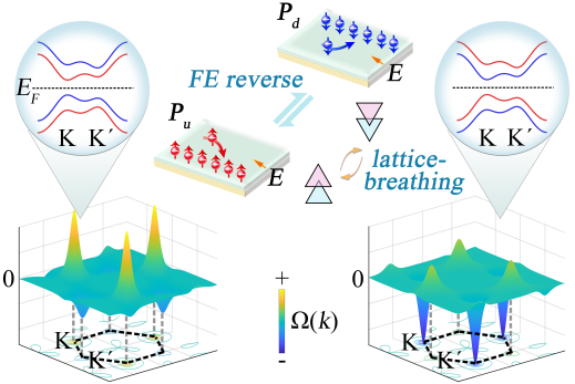 进展二:二维体系中的能谷多铁性对于能谷电子学的研究和应用具有重要意义。能谷多铁性,即单相中的铁谷性和初级铁性耦合,为反转反常能谷霍尔效应提供了一条便捷的途径。目前,该领域的研究主要集中在铁磁铁谷性,而铁电铁谷性的研究很少。使用对称性分析和构建紧束缚模型,团队提出了一种二维磁晶格中铁电性与铁谷性耦合的新机制,即单相能谷多铁性。这种机制与磁晶格的非典型呼吸性质有关。重要的是,与贝利曲率相关的能谷物理可以在铁电转变下反转,从而实现铁电可逆的反常能谷霍尔效应。基于第一性原理计算,进一步证实了二维磁性材料单层Gd2CO2中的能谷多铁性。所探索的现象和机制不仅对能谷多铁性的基础研究有意义,而且在纳米器件中具有广泛的应用前景。相关研究成果以 “Atypical breathing driven two-dimensional valley multiferroicity” 为题发表于Materials Horizons国际期刊上。论文第一作者为2023级博士生冯阳阳,马衍东教授和戴瑛教授为共同通讯作者,山东大学为唯一作者单位。