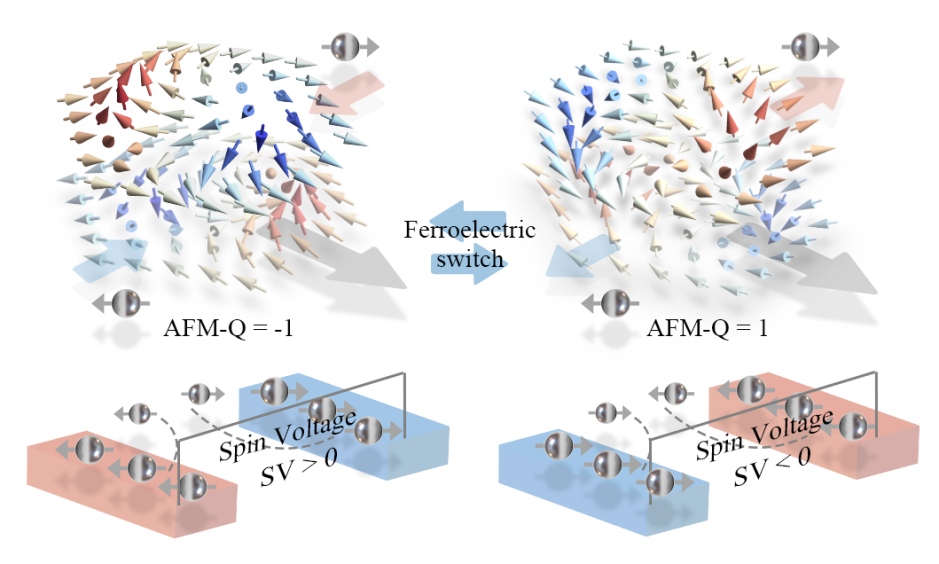 进展一:拓扑自旋霍尔效应由非共面自旋与实空间拓扑耦合引起,是凝聚态物理中的重要现象之一。然而,其固有的鲁棒性致使其物理特性难以有效调控。这一基础性难题也使得它在当下难于在自旋电子学领域实现应用。为解决这一挑战,团队提出了一种能够有效控制TSHE的方法。通过对称性与模型分析发现,在反铁磁bimeron体系中,反铁磁拓扑电荷及作用于导电电子上的洛伦兹力,可以与Dzyaloshinskii-Moriya(DM)相互作用的手性实现耦合。这种耦合意味着TSHE可以被铁电控制。利用第一性原理计算和原子自旋模型模拟,这一机制的有效性在实验合成的二维多铁体系CuCr2Se4中得到进一步证实。该体系中可变的DM相互作用手性是实现该机制的关键。这一成果成功地将 TSHE 拓展至自旋电子学的应用范畴之中,为自旋电子学的深入研究开辟了全新的方向。相关研究成果以“Engineering topological spin Hall effect in 2D multiferroic material”为题发表在Advanced Science国际期刊上。论文第一作者为2023级博士生窦恺莹,马衍东教授和戴瑛教授为共同通讯作者,山东大学为唯一作者单位。