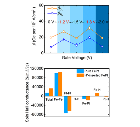 近日,胡季帆教授团队经过研究,提出过渡金属/重金属合金中的3d电子在5d近邻的影响下,其电流-自旋流转换的能力得到了急剧提高,并且与5d电子的自旋轨道耦合效应形成竞争,形成了全新的电流-自旋转换过程。并且体系的净自旋流由3d金属主导。 此外,实验进一步表明,正电压下注入氢离子可使垂直磁化翻转的临界电流密度降低43%,SOT效率提升65%,在负电压下恢复到初始状态。深度分辨二次离子质谱(SIMS)和第一性原理计算进一步表明:3d-5d体系除了可以诱导3d电子的强自旋轨道耦合,还保留了3d电子的化学活性,因此其与氢的作用使得体系自旋霍尔电导大幅提升130%。该研究不仅为单层合金SOT器件设计提供了新思路,还通过离子-电子耦合效应为自旋电子学开辟了新方向。