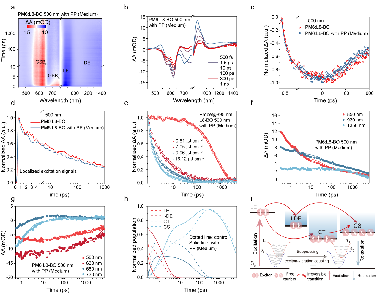 近年来我国提出了“双碳”战略目标,旨在推动能源结构的转型,实现可持续发展。这一战略要求加快构建清洁低碳、安全高效的能源体系,是我国能源革命的主攻方向。有机光伏作为可再生能源技术之一,利用有机半导体材料将光能转换为电能,具有重要的应用前景。但是其产业化应用受到了效率偏低、稳定性较差、难以生产均匀且无缺陷的薄膜等问题的制约,特别是对内在分子间相互作用、形貌演化规律以及对光物理过程的影响缺乏理解是限制器件性能提高的关键科学问题。基于该背景,团队提出了一种调制绝缘物分子量的稀释策略。通过引入不同分子量的聚丙烯,有效诱导受体分子有序堆叠,调控纤维尺寸,促进更多激子在受体相内高效传输,从而实现了从局域到离域的激子扩散增强。该策略通过抑制激子-振动耦合,调控激发态演化路径,最终使有机太阳能电池表现出卓越的厚度耐受性。