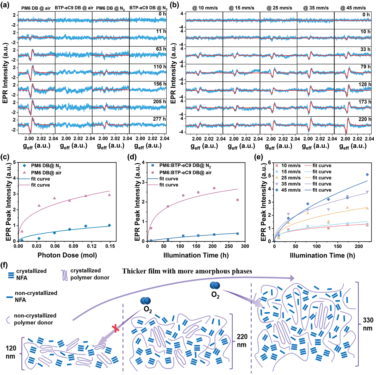 进展二:随着有机光伏能量转换效率的提高,增强与大规模生产工艺兼容的器件的稳定性至关重要。研究团队对空气中制备的有机太阳能电池的稳定性进行了深入研究。在光照下,厚活性层器件比薄活性层器件显示出更快的陷阱态产生、电荷收集效率降低以及短路电流密度衰减。在排除活性层材料降解及形貌的变化之后,研究阐明其衰减主要来自于聚合物给体在光照下产生的自由基。厚活性层在单位厚度中具有更多非晶相,空气中的氧分子更易扩散,光照下产生更多自由基,从而引起器件性能的快速衰减。该工作为设计高效、稳定、可规模化制备的有机太阳能电池提供了重要参考。相关工作以“Enhance Photo-Stability of Up-Scalable Organic Solar Cells: Suppressing Radical Generation in Polymer Donors”为题发表于《Advanced Materials》,山东大学硕士研究生肖梦飞为论文第一作者,通讯作者为山东大学杜晓艳教授,山东大学为论文第一作者单位和唯一通讯作者单位。