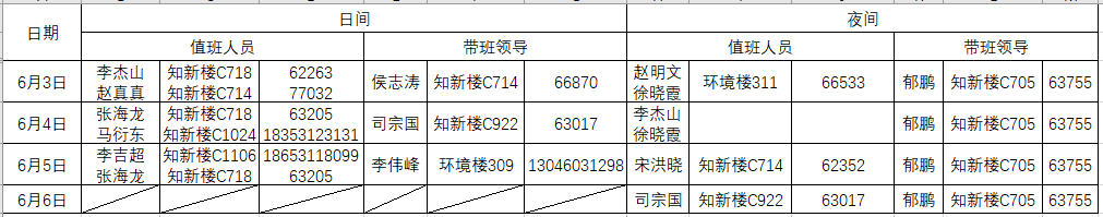 端午节假期,院领导导各学院疫情指挥小组领导及成员安排值班值守,学院严格执行24小时值班值守制度,加强假期突发事件应急处置,从严执行信息报告制度,确保假期安全平稳。端午节假期,每天下午3点前通过学校信息化服务平台“数据服务”做好“日报告”“零报告”报送工作。突发情况或重要信息第一时间向学校总值班室报告。附值班表: