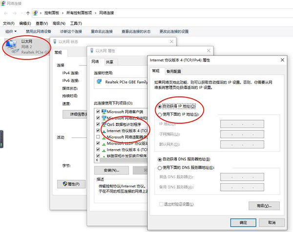 “网络和Internet”设置——更改网络适配器选项——“以太网”属性——Internet协议版本4——改为“自动获得IP地址”