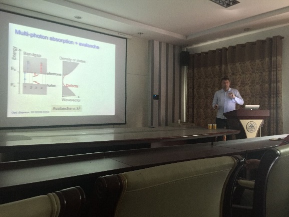 Juodkazis教授是国际光学工程学会(SPIE)会士,美国光学学会(OSA)会士,Optics Express、Optical Engineering等SCI期刊编委,目前担任斯威本科技大学微光子中心副主任,纳米技术设备实验室负责人,长期致力于研究光微流、光存储以及光子晶体应用的三维飞秒激光微加工技术,享有很高的国际学术声誉。Juodkazis教授分别于8月4日上午和5日上午在我院离子束报告厅作了题为《Sensing with Nano-textured Surfaces》和《Laser Fabricating 3D Material Structuring》的两场学术报告。两场报告分别介绍了Juodkazis教授的研究团队在运用高精度3D方法在光学传感和纳米制造等领域中取得的进展以及采用飞秒激光微加工方法制备高灵敏光学传感器、光子学器件中的应用等。两场报告均由陈峰教授主持,开云online(中国)20余位教师及研究生参加了报告会。报告内容充实详尽,会后多位教师与Juodkazis教授对报告内容进行了详细交流与探讨。