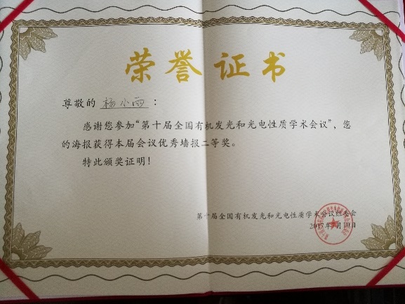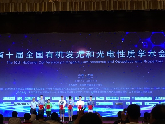 另外,郝晓涛课题组一行六人参加了前期在山西太原举行的第十届全国有机发光和光电性质学术会议,该会议由中国物理学会发光分会主办,太原理工大学承办,参会总人数超过600人,杨小雨同学获得优秀墙报二等奖。