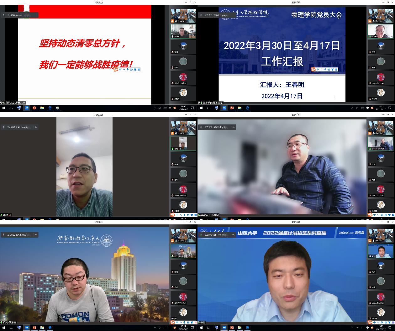 会上,原子与分子研究所所长、党支部副书记马衍东教授,分享了自己驻校期间的学习、教学、科研和生活情况,表达了干事创业热情不减的激情、科研保质保量推进的担当以及抗疫必将胜利的信心;凝聚态党支部副书记王春明教授,分享了理论学习情况,谈及开云登陆入口基础学科人才培养的有关精神和要求,为广大教职工投身学院学科建设鼓足了干劲,特别宣扬了获山东省自然科学一等奖并由山东电视台报道的仝殿民教授在量子信息领域取得的成绩,以身边人的事迹激励大家强院兴校的自觉,并从牛顿力学发展史引申到疫情防控,为大家坚定了抗疫的信心;光电所党支部书记陈明研究员,着重从做好实验室运转、管理向大家介绍了情况,封校期间搭建起校内外导师的桥梁,为学生正常开展实验保驾护航;粒子党支部李洋洋教授,重点围绕在线教学的互动性问题进行了交流,分享了与研究生沟通交流的问题;机关党支部、院办主任侯志涛,分享了学院在封校期间如何做好服务管理保障工作;校外工作组组长副院长秦伟教授,围绕做好校内师生的保障工作进行了交流;学院党委副书记辛莹,围绕学工队伍工作从教育、管理、服务三个方面进行了交流。