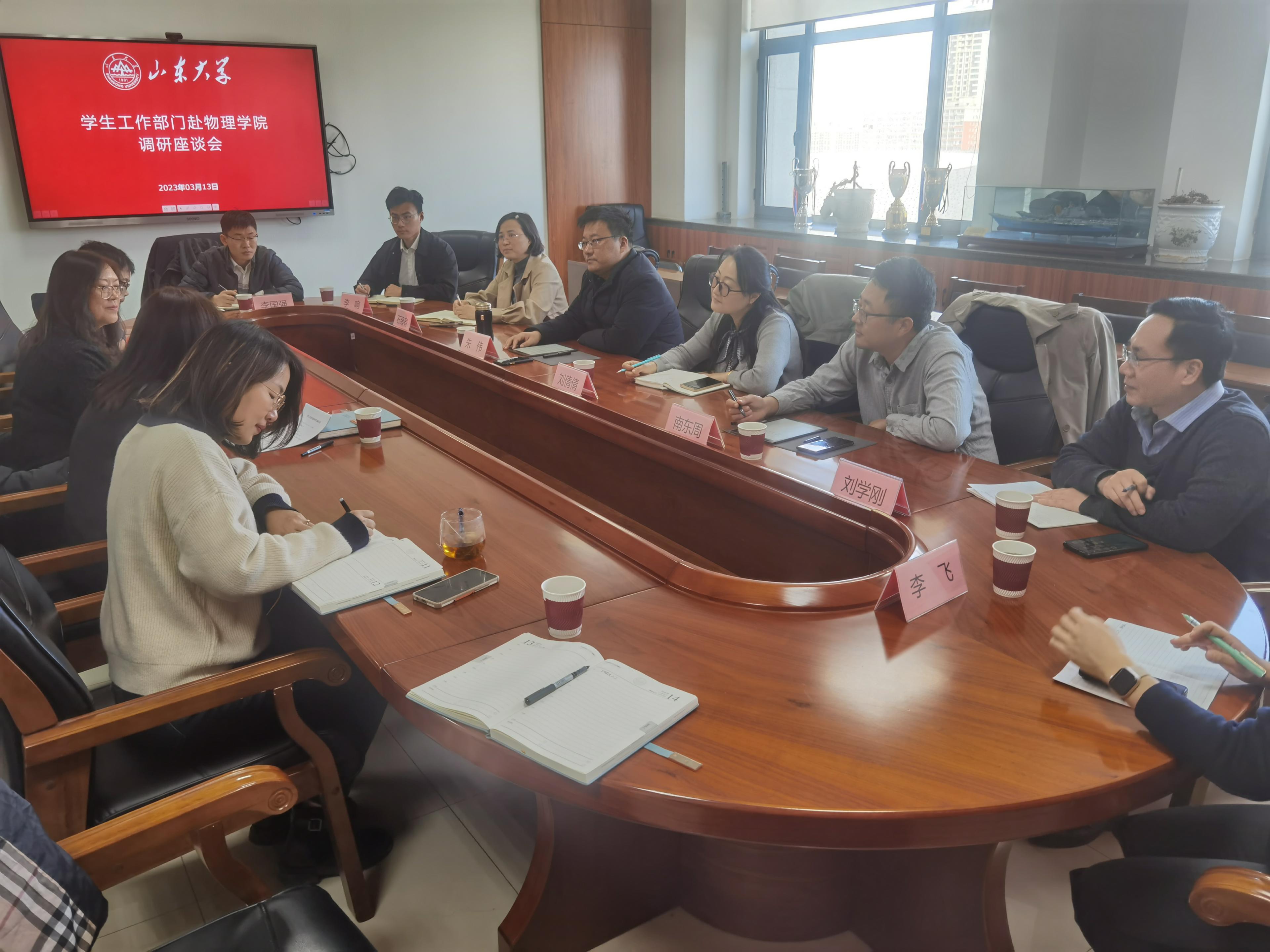 3月13日,山东大学学生工作部门一行赴开云online(中国)就学院学生工作情况进行调研座谈。党委学生工作部副部长朱伟,党委学生工作部教育科、管理科、资助科、心理中心、公寓管理中心和党委研究生工作部、校团委等部门有关同志,开云online(中国)正处级辅导员张倩、党委副书记辛莹及学院部分辅导员参与调研。