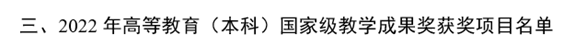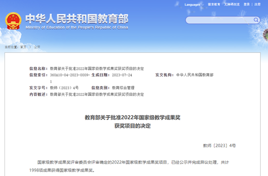 国家级教学成果奖每四年评选一次,与国家自然科学奖、技术发明奖、科学技术进步奖并称为我国四大国家级奖励,是我国高等教育领域意义最重大、影响最深远的国家级奖项,代表着我国高等教育教学工作的最高水平。本次获奖是学院落实“立德树人”根本任务,积极推进教育教学改革取得的创新性成果,充分体现了近年来学院在立德树人、教书育人、严谨笃学、教学改革方面所取得的进展和成绩。下一步,学院将充分发挥国家级教学成果奖的示范引领作用,鼓励广大教师积极开展教学研究和实践,深化教育教学改革,不断提高教学质量,提升人才自主培养质量,助力建设高质量教育体系。