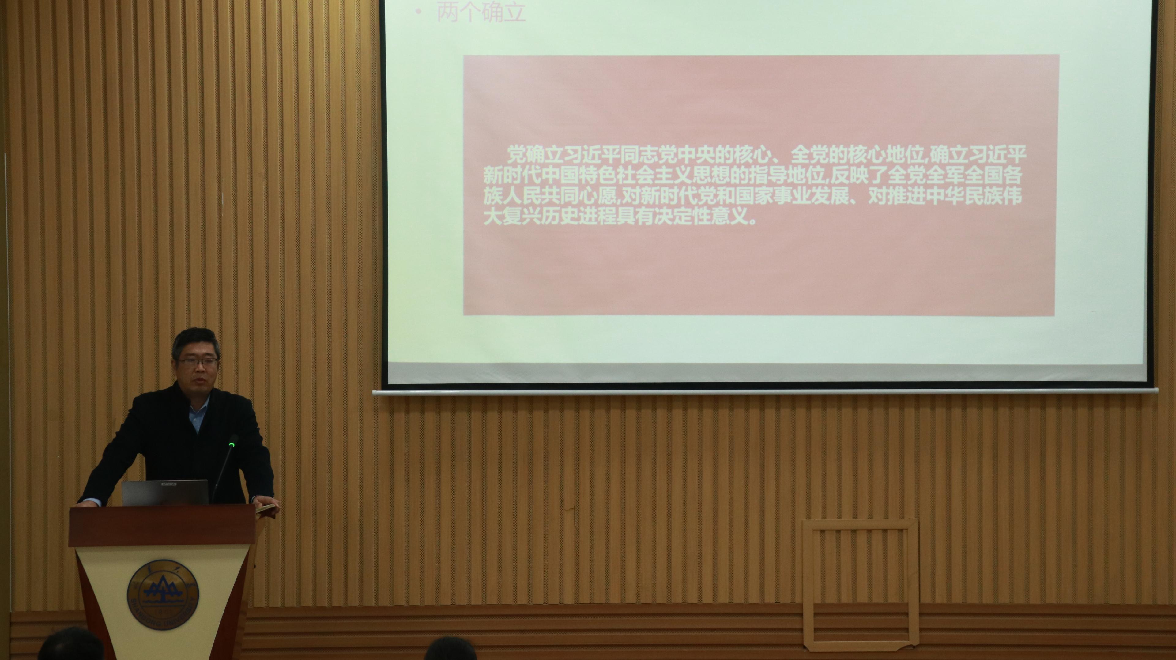 伴随着雄伟的国歌声,团代会正式拉开序幕。郁鹏代表学院党委对大会的召开表示祝贺,并带领与会代表集体学习了党的十九届六中全会精神,他以四个历史时期四个伟大飞跃、马克思主义中国化的三次飞跃、两个确立、五个方面历史意义、十个“坚持”历史经验、牢记一个根本问题、一个号召等七个部分为纲逐一解读了《中国共产党第十九届中央委员会第六次全体会议公报》和《中共中央开云登陆入口党的百年奋斗重大成就和历史经验的决议》。学习最后,他号召全院学子要心怀“国之大者”,坚持“四个面向”,从党的百年征程中传承弘扬伟大建党精神,从老一代物理人的不懈奋斗汲取科学家精神,努力研究真问题、做真学问,争做时代先锋。随后,曹晓习作《山东大学开云online(中国)团委2021年工作报告》,她以“着力增强‘三性’,服务青年成才”为题向与会代表报告了学院团委2021年聚焦政治性、先进性、群众性全面开展思想引领、素质拓展、服务师生等的各项工作成果。