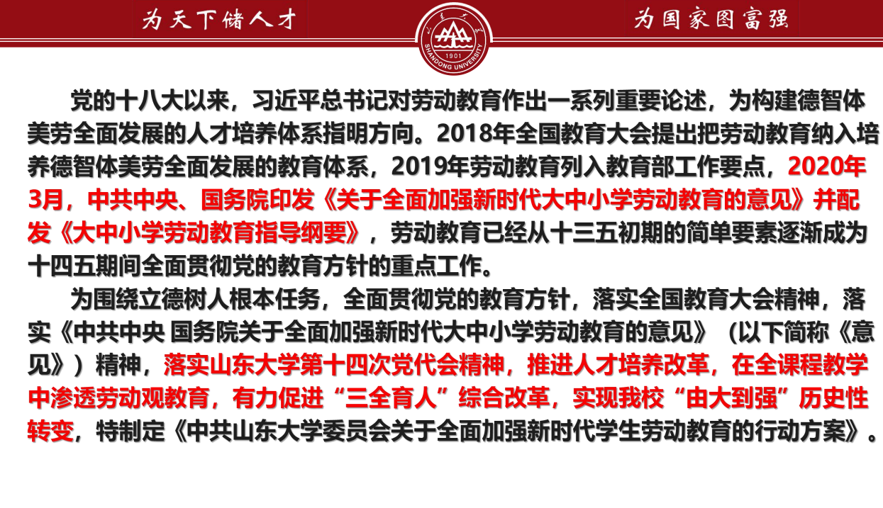 活动第二部分,曹晓习为同学们进行了《中共山东大学委员会开云登陆入口全面加强新时代学生劳动教育的行动方案》的政策解读,她带领同学们了解了方案制定的背景、主要考虑,逐一梳理了方案的框架和重点内容。在此基础上,她又就学院的劳动教育方案、劳动教育清单进行了详细介绍,鼓励同学们积极参与各类劳动教育实践活动,在参与志愿服务、社会实践、专业实践、就业指导、创新创业、校园实践岗位和宿舍日常生活中培养劳动兴趣、磨练意志品质、增强社会责任感、提高实践能力,促进身心健康和全面发展。