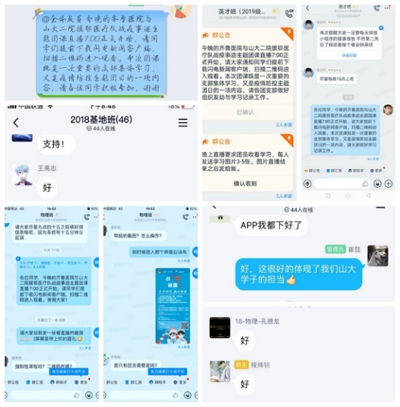 2019级物理班团支部孙文青:2月29日晚,我们线上学习了战“疫”团课,在“迎难而上是我们的担当,你无畏艰险,为我们后辈做榜样”的歌声中,致敬山大“最美逆行者”。国难当头,山东大学齐鲁医院、山东大学第二医院的医务人员们奔赴战“疫”前线,同湖北人民共同奋战。因为有你们,多少白衣天使的存在,我们相信武汉人民一定会在樱花烂漫时,迎接希望白昼。