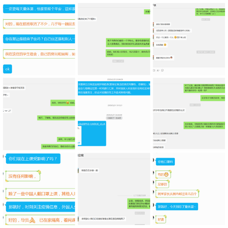 做好海外交流学生人文关怀。通过QQ、微信、钉钉等多种渠道与每个海外交流学生保持密切联系,实时关注他们的学习进展、住宿情况、情绪状态、物资储备等,积极向学生传达学校、学院期待所有同学安全健康、学成归来的美好祝福。及时回应并帮助解决学生的困难和需求,为买不到口罩的海外交流学生邮寄口罩。