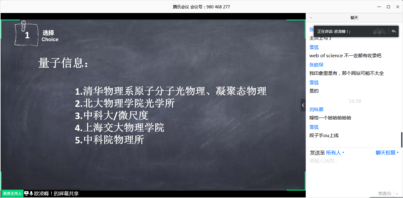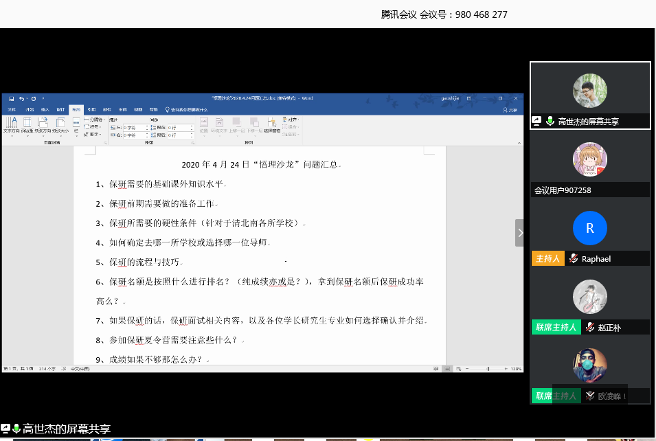 4月24日下午15点30分许,开云online(中国)“悟理沙龙”生生交流活动在翘首以盼中揭开帷幕。本次“悟理沙龙”以“保研经验分享交流”为主题,邀请到2016级成功保研至清华大学、北京大学、南京大学的5名优秀学子与大家线上分享保研历程中的点点滴滴,交流切身体会,分享宝贵经验,共90名物理学子参与此次线上分享交流会。