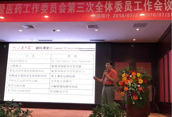本次会议的主题为“互联网+课程+教材”。吉林大学张汉壮教授、南京大学王炜教授、同济大学王祖源教授、首都医科大学刘志成教授、北京交通大学吴柳教授、北京大学喀蔚波教授、喀什大学天山学者、山东大学刘建强教授及喀什大学郭亮副教授做了大会特邀报告。刘建强教授主要介绍了我院在线开放课程建设与应用情况,特别推介了刚刚完成的医用物理学mooc。与会专家学者们就医药类专业物理课程的发展趋势、“十九大”后新时代物理教学模式、教学方法的改革及医药类专业物理课程面临的困境进行了深入交流和探讨,并对从事物理课程教学的新一代年轻人提出了希望和要求。