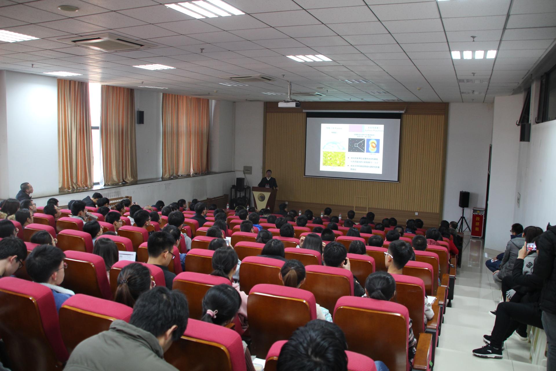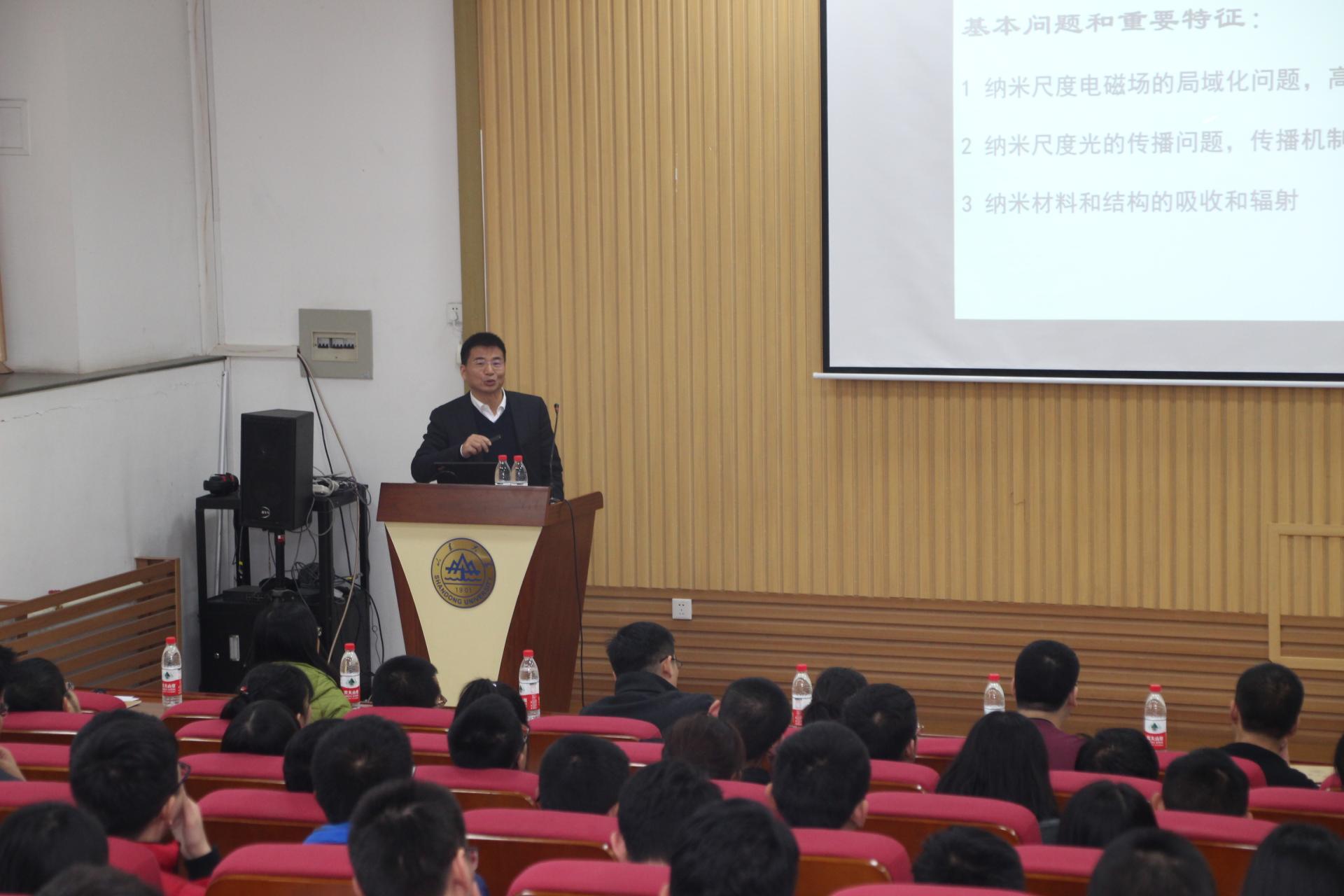 座谈会后,徐红星作客“稷下风”讲坛,为山大师生做了“等离激元光子学和纳米光学基本问题研究”的学术报告。他从光学的发展历史开始,介绍了光学领域的研究热点“等离激元光子学和纳米光学”,着重介绍了纳米间隙等离激元耦合结构的发现、纳米光学超灵敏传感原理,以及在单分子表面增强拉曼光谱上的应用,同时,也介绍了自己最近比较从事的前沿课题,主要是微纳光电技术和辐射制冷技术在光辐射与吸收方面的应用研究。报告结束后徐红星与师生进行了交流。