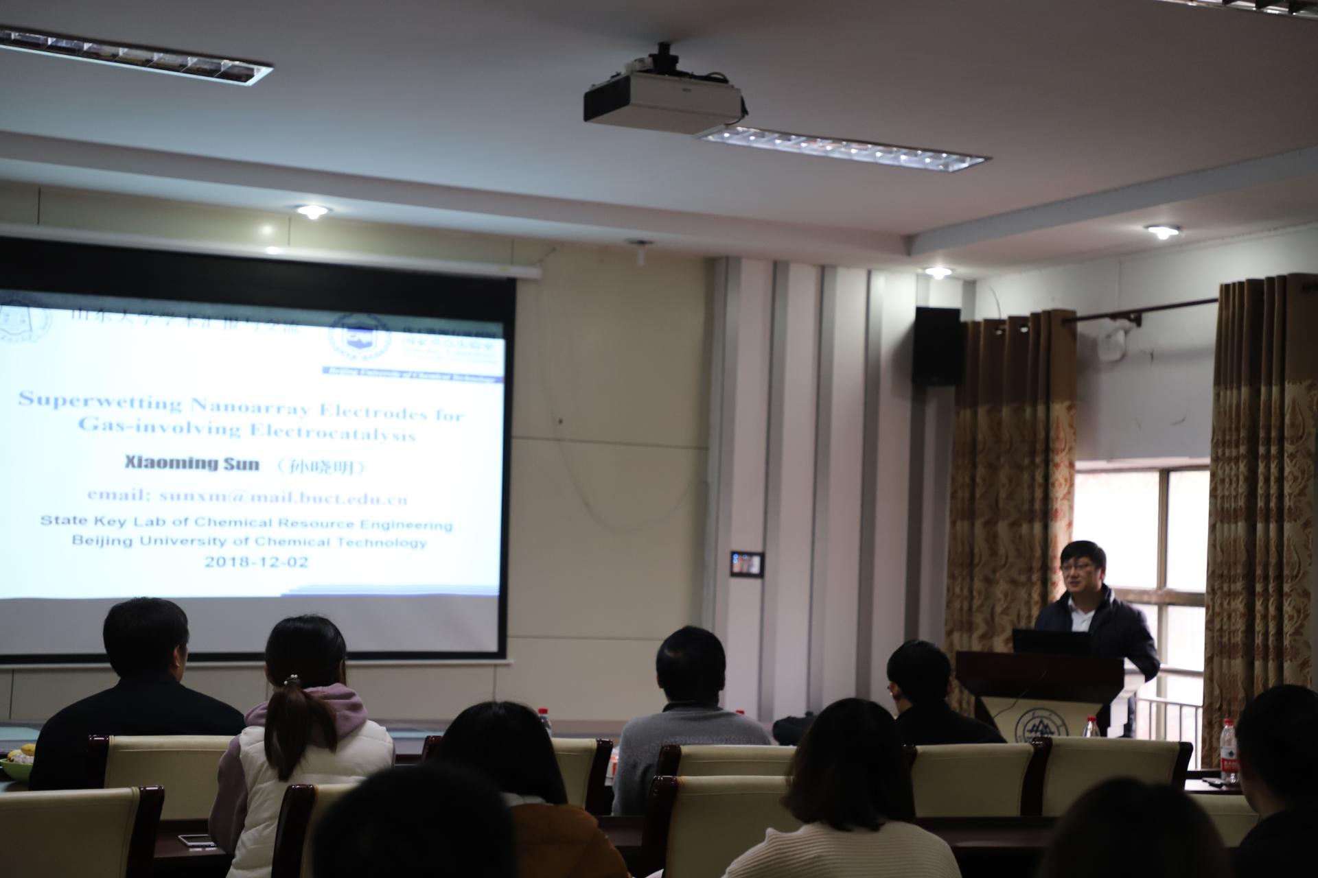 首先,孙晓明教授作了《气体超浸润纳米阵列电极》专题报告,对气体超浸润纳米阵列电极和无机纳米结构的分离与组装领域取得的进展进行了集中阐述。概述了结构化阵列电极的构筑、浸润性调控原理及手段和超疏气、超亲气电极在各类反应中的应用实例等;阐述了超浸润结构化电极在气体参与的电化学反应中的作用原理、调控手段及应用实例等,提出了气体参与的电催化反应新的研究方向。此外,从概念到应用分享了密度梯度离心分离纳米颗粒的技术,实现无机功能纳米材料、碳纳米材料的可控合成、结构调控、分离纯化、有序组装以及在能源化学中的应用。