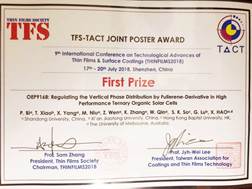 2018年7月17-20日,由国际薄膜学会主办的第九届国际薄膜大会(Thin Films 2018)在广东深圳市举办。我院郝晓涛课题组一行10人参加会议,博士生毕鹏青同学获得大会最佳海报奖唯一的一等奖。通过参加本次会议向全国同行展示了团队的最新研究成果,提高了山东大学物理学科有机电子学方向的学术影响力。
