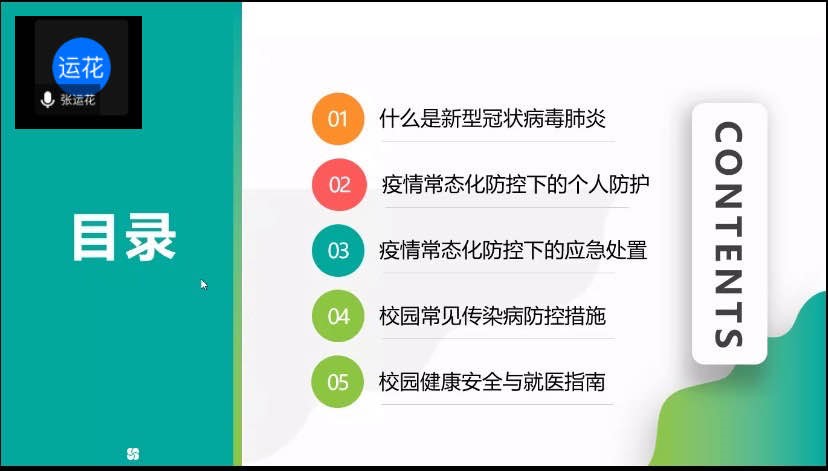 为响应特殊时期下国家疫情防控政策要求,提高本科新生的健康防护意识,营造安全健康的校园环境,9月16日晚,开云online(中国)于腾讯会议平台开展2020级新生入学健康教育,校医院张运花担任主讲人,为同学们讲述后疫情时代校园疫情防控的重要举措。