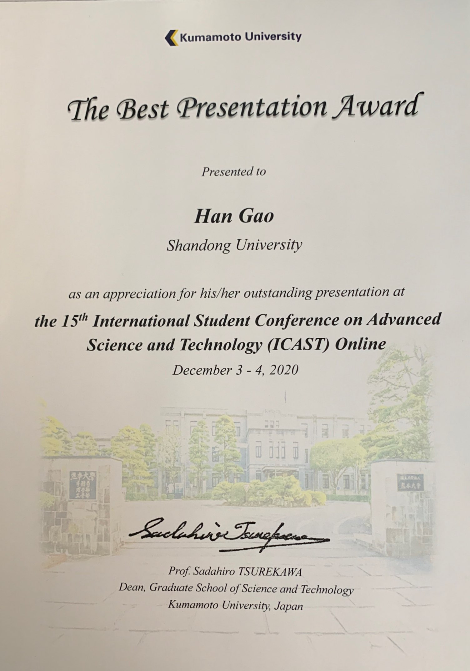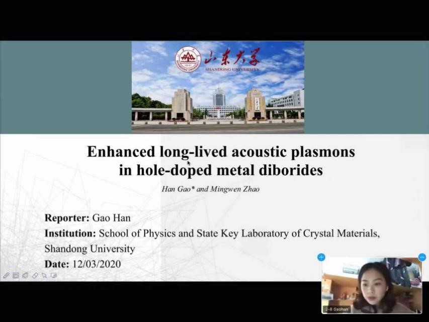 由日本熊本大学承办的“第十五届国际学生高科技论坛(ICAST)”于2020年12月3日至4日通过线上会议的形式召开。我院赵明文教授课题组2019级在读博士生高涵同学的报告“Enhanced long-lived acoustic plasmons in hole-doped metal diborides” 荣获“最佳报告奖”。