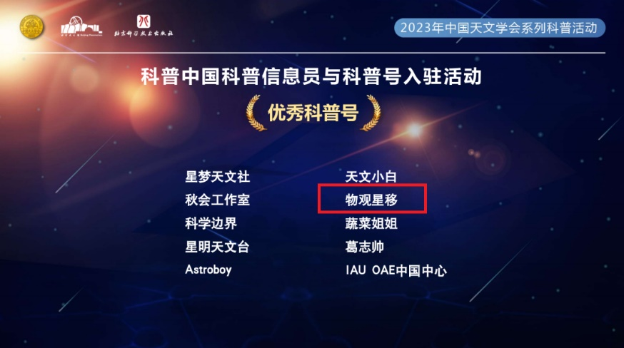 中国天文学会天文科普系列活动旨在“提升基层科普服务的能力和水平,营造热爱科学、崇尚创新的社会氛围,为提升全民科学素质做出积极贡献”。本次评审,推评确定全国“优秀科普号”共计10个。“物观星移”天文科普志愿服务团队将以此次推评为契机,进一步扩大天文科普活动覆盖面、影响力,增强科普活动参与感、获得感,助力弘扬科学精神、传播科学知识、激发科学兴趣。