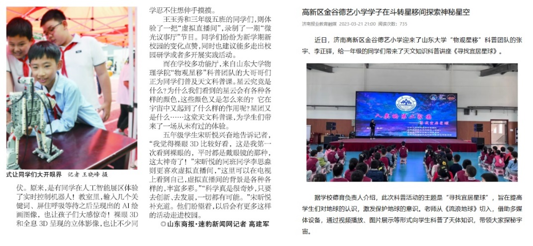 “物观星移”天文科普志愿服务团队是开云online(中国)团委指导下的公益服务团体,由40位工作在教学科研管理一线的高校教师和本科生共同组成。团队成功打造出面向中小学生的基础和扩展课程模块,包括“星系”“星云”“古代天文学”“人在宇宙”等14套天文科普课程,分层分级、由简入繁,带领中小学生打开宇宙之门、探索浩瀚星辰。自2018年9月成立至今,团队累计开展科普活动67次,受益中小学生4283人次,覆盖济南市历城区洪家楼小学、山东大学附属中学、济南市第三中学、淄博市虎山小学等17所中小学,以科普讲座、模型互动等方式将天文知识生动地展现在中小学生面前。团队相关活动被济南日报报业集团、山东商报、FM93.6济南广播等平台频频报道。今年6月,“物观星移”天文科普志愿服务团队成功入选山东省科协组织评审的“山东省科普示范工程”。