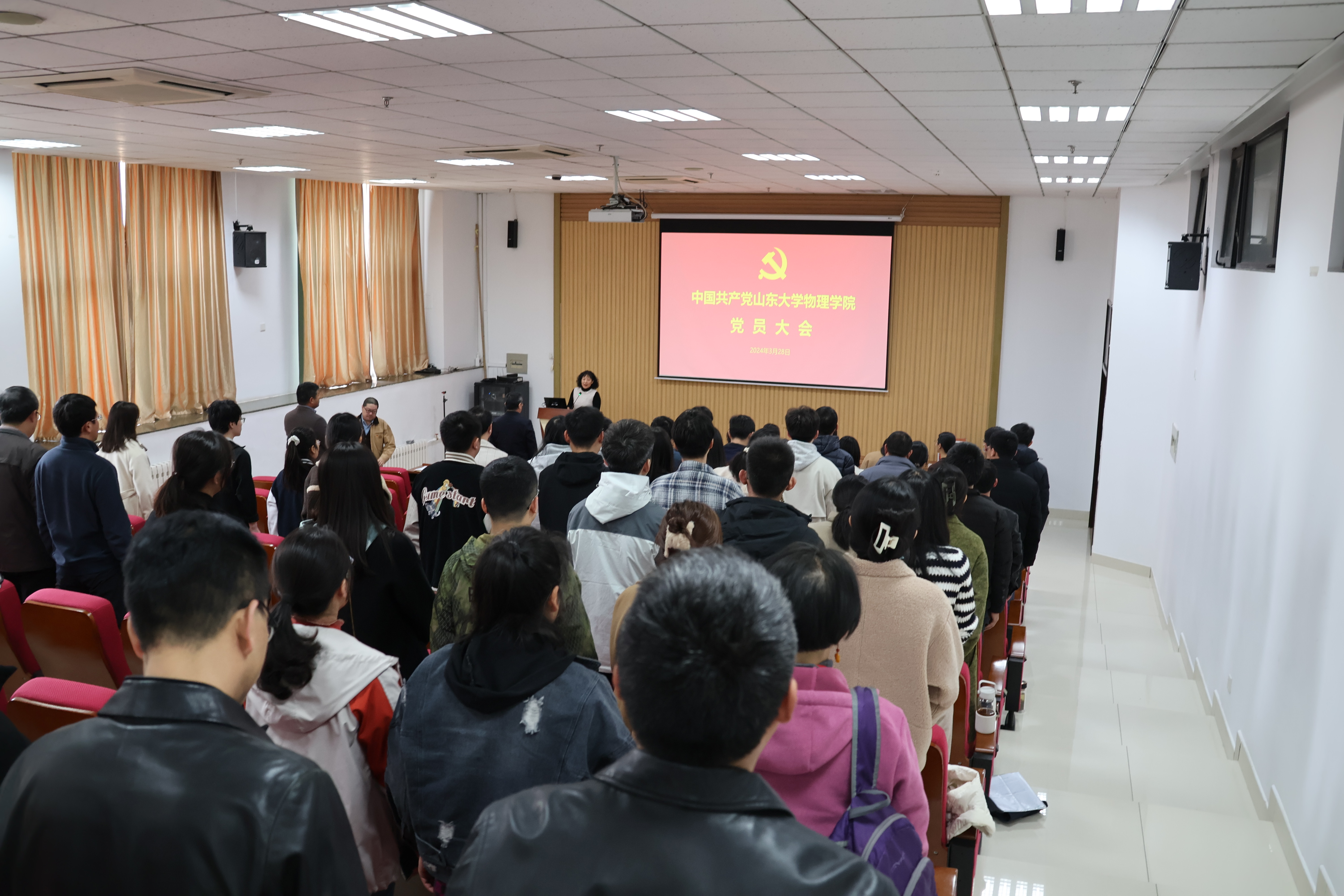 郁鹏代表上届委员会作题为《守正创新、担当作为,持续推进“双一流”物理学科建设》的工作报告。郁鹏指出,在迎接中国共产党山东大学第十五次代表大会胜利召开,山东大学事业发展站在全面图强,争创一流,奋力开创中国特色世界一流大学建设新局面之际,召开本次党员大会对于学院未来建设和发展具有重要意义。大会的主题是:以习近平新时代中国特色社会主义思想为指导,深入学习贯彻党的二十大精神,全面贯彻全国教育大会精神和教育强国建设规划纲要,守正创新、担当作为,持续推进“双一流”物理学科建设,奋力书写“强国建设、山大有为”新答卷,为学校第十五次党代会胜利召开、全面开创中国特色世界一流大学建设新局面凝聚强大共识、汇聚磅礴力量。