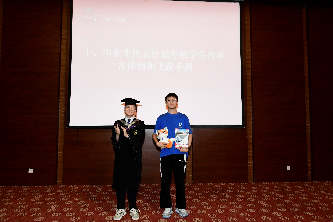 师恩如山,永生难忘。典礼现场,2024届毕业生同学们向学院教师代表、辅导员代表献花,表达了最真挚的敬意和感激之情。岁月流转,英才辈出。为进一步传承精神、点亮梦想,2024届毕业生代表郭尚祎将物院吉祥物与凝结了学长学姐智慧经验的《飞跃手册》传承给低年级学生代表孙浩,激励他们继续发扬物院优良传统,用智慧和热情书写崭新篇章。