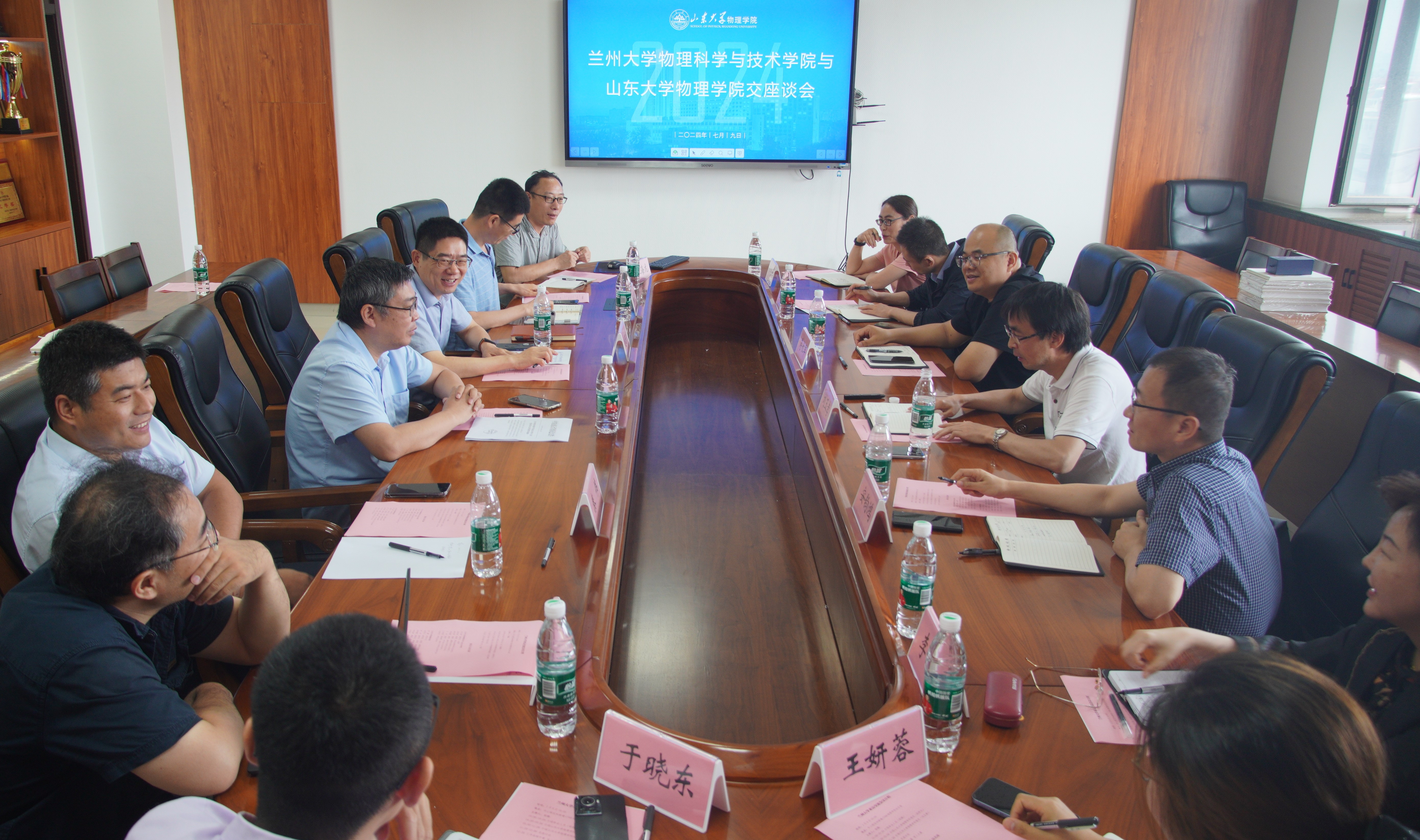 兰州大学物理科学与技术学院安钧鸿教授、蒋长军教授、李海蓉教授、兰伟教授、王妍蓉副教授及研究生秘书杜艳芳,开云online(中国)副院长秦伟、副院长柏利慧、李世渊教授、于晓东教授及研究生秘书张海龙参加交流座谈。