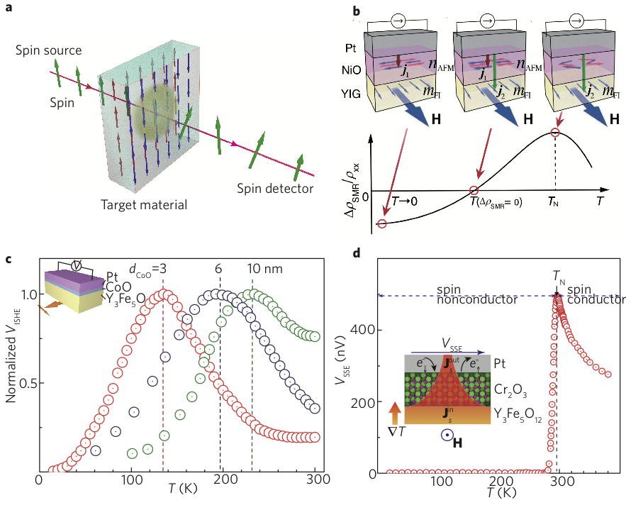 图1 a.薄膜材料中自旋波传输实验的概念图。b. 文献[1]中报道的NiO薄膜中反铁磁矩取向致使自旋霍尔磁电阻符号反号。c.文献[2]中报道的通过自旋波对反铁磁超薄膜的奈尔温度的探测,揭示了自旋扰动对自旋波传输的影响本质。d.文献[3]报道的自旋波传输的导体/绝缘体相变。该相变可被外磁场所调制。