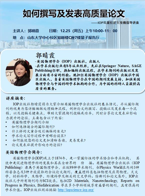 IOP出版社郭晴霞将为大家介绍英国物理学会出版社的基本情况,并从国际期刊的视角为您详解编辑处理稿件流程,剖析论文的撰写、投稿以及发表每一个流程,以及投稿关键要点,帮助大家提期刊投稿成功率,同时分享论文发表后影响力提升的途径,主要包含以下内容: